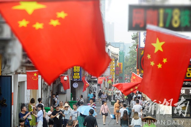 9月26日,长沙市天心区太平老街上挂满了五星红旗。随着国庆节的临近,长沙城区的一些主要街道悬挂起鲜艳的国旗和红灯笼,充满喜庆气氛。