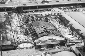 记者注意到,市场内有4个大棚被烧毁,主要是生鲜区和蔬菜区的大棚。大棚内地面上散落着碎玻璃与碎石块。大棚后方堆放着几个铁皮油桶,地上满是油污,旁边还散放着几个液化气罐。棚里面的货物大多已烧毁。