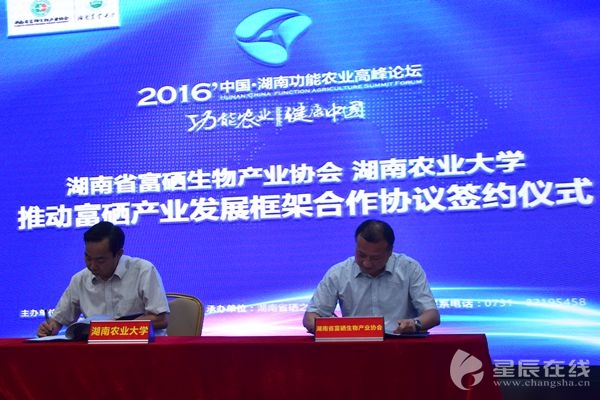 (首届湖南功能农业高峰论坛暨“1223”富硒工程洽谈会现场,湖南农业大学党委书记周清明(左)与湖南省富硒生物产业协会执行会长兼秘书长杨俊(右)签订推动富硒产业发展框架合作协议。)