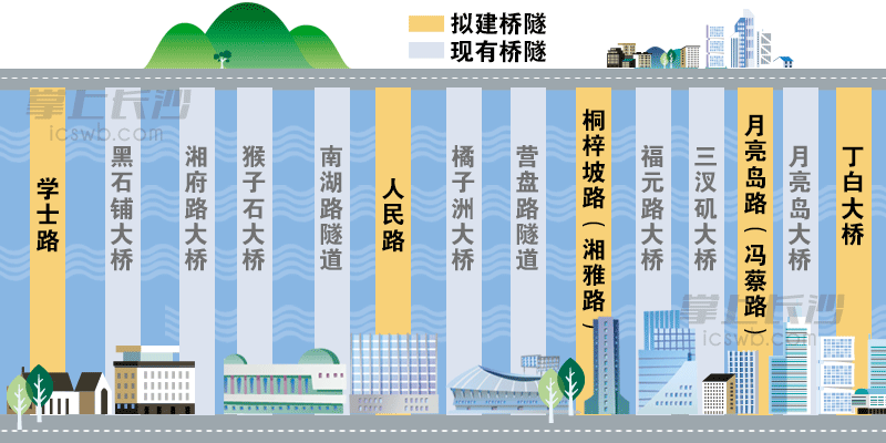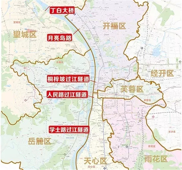 5月16日,湖南湘江新区官方网站公布了《湖南湘江新区发展规划(2016—2025年)》(以下简称《规划》)。根据《规划》,湘江新区建设过江通道,新增人民路、桐梓坡路(湘雅路)、月亮岛路(冯蔡路)、学士路、丁白大桥等过江桥隧。