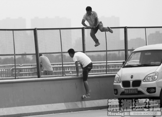 9月7日下午,在湘江长沙综合枢纽大桥中部发电站上方的桥面上,停放着几辆私家车,几名男子在车旁张望,几杆自制的划鱼钓竿就放在一旁。其中一名男子称,他们以前经常在此划鱼,以前都是穿过大桥两侧破旧的防护网进行划鱼,但赶过来才发现防护网已经修护,于是准备离开。“划鱼追求的是刺激的感觉,跟钓鱼不一样,”一名男子称。