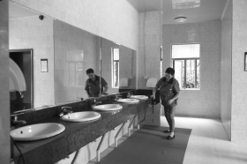 男清洁工徐长林说,目前上级对他们工作要求非常高,有垃圾就要随时处理。“每天早上我都清理蜘蛛网,擦亮窗户,随时抹干洗手台上的水。”徐长林说,他们从早上7点一直工作到晚上10点。墙上的一张记录表显示,从上午到晚上都有人根据7个标准进行巡查。
