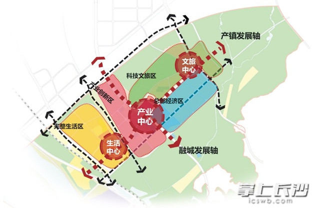 着眼于长株潭融城发展的商务服务功能构建,与科创小镇功能相呼应,规划建设面向新兴科技领域的商务会展中心,整合产品展贸、技术股权交易、会议论坛、商务服务等多种服务功能,打造地理信息等新兴科技产业的产业服务中心。