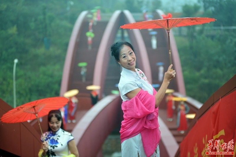 佳丽们撑着优雅的油纸伞,踏着音乐的节点走过“中国结”步行桥。