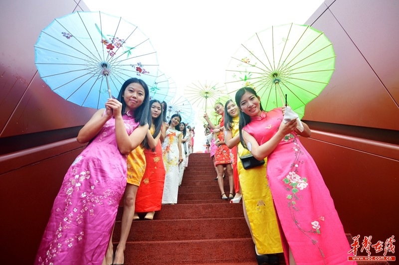 百名湘女身着由湖南湘绣研究所提供的湘绣旗袍,踏着音乐的节点优雅地走过“中国结”步行桥,与绿意盎然的梅岭公园和银杏公园美景交相辉映,更显娇媚、典雅,成为一道靓丽的风景,吸引众多围观群众驻足欣赏。