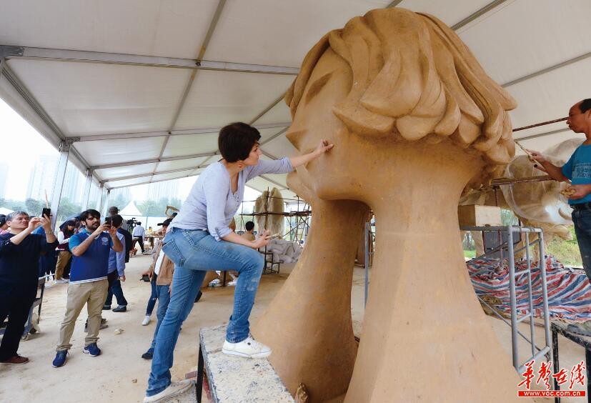 长沙洋湖湿地公园2016长沙雕塑文化艺术节创作现场一片忙碌,各种肤色的雕塑家们正在为自己的作品进行最后的打磨与润色。各国使节立即被眼前形态各异、匠心独具的雕塑作品吸引,大家纷纷拿出手机拍照、合影,有的还通过翻译现场与雕塑师交流。