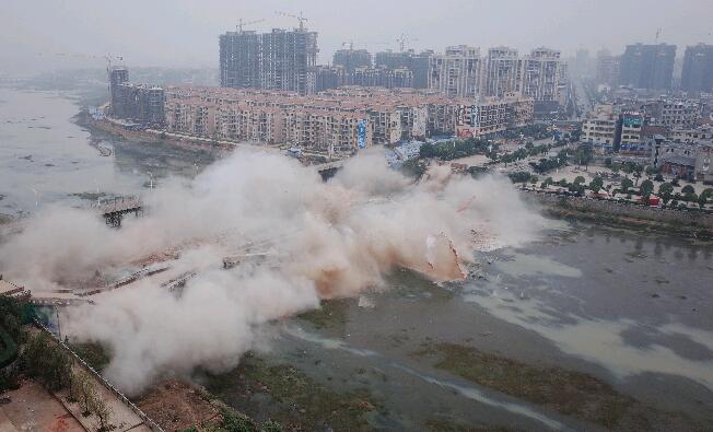 10月17日下午16时16分,安仁县永乐江中游的的安仁大桥成功爆破。此次爆破共钻爆破孔1000余个,使用炸药900多公斤,导爆管、雷管1000多发。 于振宇 刘珍 摄影报道