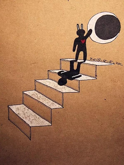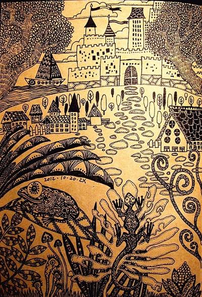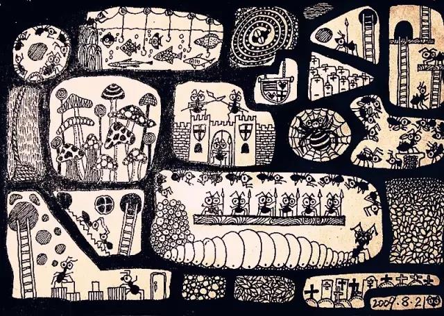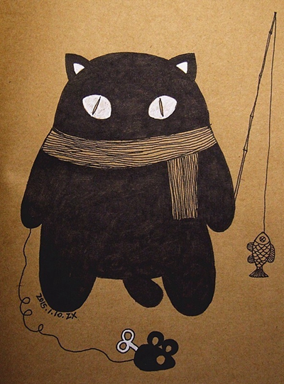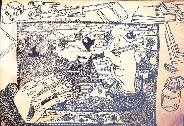 后来的经历,他说就跟千千万万的中国美术生一样,经历高考,考上大学。四年本科他读的是设计专业,这个专业似乎意味着告别了画家梦,但是在学设计课程时因为经常需要画手绘图,倒是激发了他用钢笔绘画的兴趣。他觉得相比起用电脑绘图,他更喜欢笔跟纸之间的“摩擦摩擦”。他的第一张插画就是在08年读大四的时候,画在一个小本子上的。