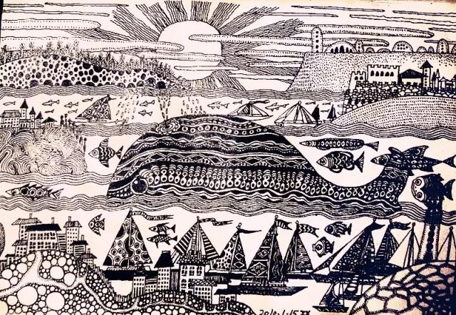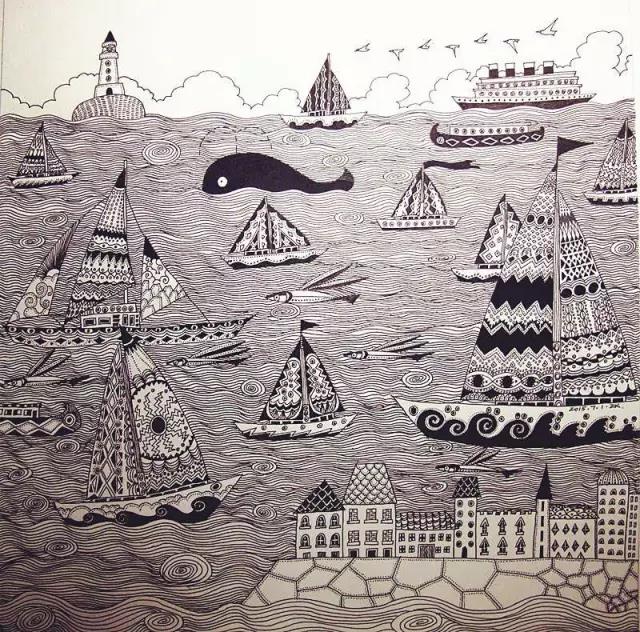 “繁复而不重复”是他的原则。在这张画海洋的插画里,每个岛屿上的纹路、建筑的风格和帆船的样式都绝不能雷同,在这方面他就有点像是强迫症。“要想在很小的平面上表达更大的世界,你必须尽可能地做到精细,才会更加吸引人,别人才会去找:这个岛上有些什么东西呀?”