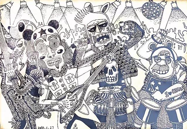 这是张鑫自己最满意的一张,画的是二手玫瑰等几个摇滚乐队在他脑子里综合之后生成的新乐队形象。在这个细节狂的笔下,每个人物身上的亮点也是可圈可点。