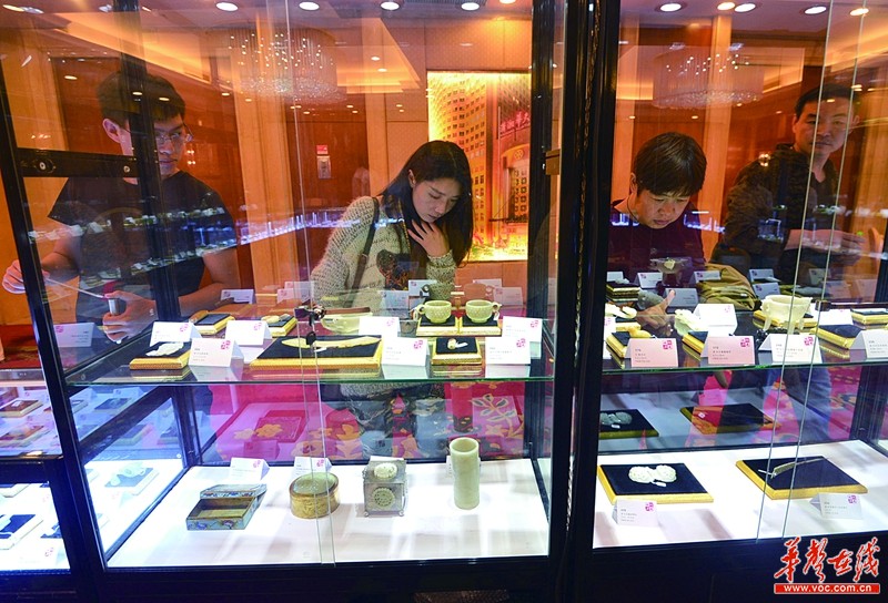 10月12日,市民在鉴赏精品玉器。当天,“2016湖南文物玉器专场拍卖会”在长沙市潇湘华天大酒店举行预展,将于14日进行玉器专场拍卖会。此次拍卖会拍品共300件,全部为中国古代玉器,已经由湖南省文物局鉴定许可。 三湘都市报记者 李健 摄影报道