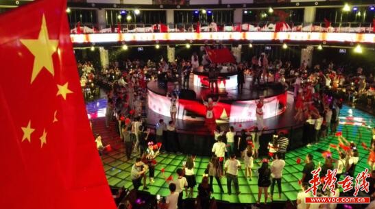 张家界云顶艺术团于国庆期间,艺术团专门编排了升国旗和《歌唱祖国》的节目,世界最大旅游文化吧的四周插满五星红旗,给游客赠送了手舞的五星红旗。“这个节目一开始,全场气氛庄严而热烈,激发了所有的人强烈的爱国情怀。在这一刻,外国游客都对我们的祖国伸出大拇指,肃然起敬!”团长魏然告诉记者。