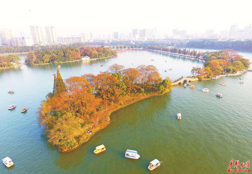 11月27日,湖南烈士公园,在明媚阳光的照耀下,湖心岛上的红叶绚丽展现,与年嘉湖的碧水相映,构成一幅色彩艳丽的风景画。湖南日报记者 李健 摄