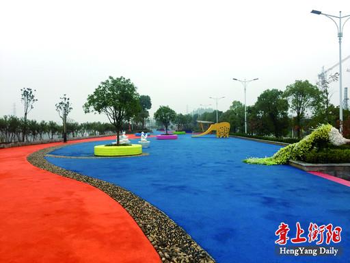 记者从蒸水北堤风光带一路向西走,远远地就被这一抹绚丽的色彩吸引了。彩色跑道位于蒸水北堤风光带西段的滨江公园内,全长1500米,跑道橙、蓝相间,中间铺有石径小路,如同一条彩带镶嵌在蒸水河畔,煞是美丽。