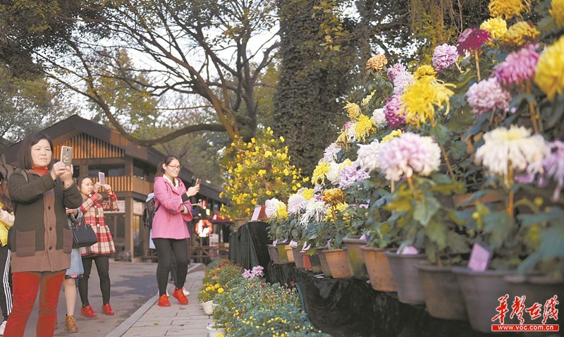 11月10日,游客在冬日暖阳中观赏菊花。近日,“Hi·悦麓”第一届菊花展在长沙市岳麓山景区举行,展出独本菊、多头菊、悬崖菊等菊花和一串红、海棠花、孔雀草等2000多个品种、2万多盆。 湖南日报记者 唐俊 摄
