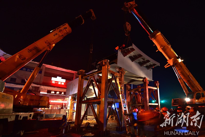 12月23日凌晨,吉首市乾州建新路,施工人员在吊装人行天桥。近年来,该市加快推进交通突围工程、城市提质工程、产业攻坚工程、民生升温工程等,着力打造宜居、宜业、宜游、宜养的精品城市,建设武陵山片区生态文化旅游中心城。 姚方 摄
