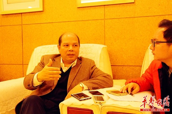 国家体育总局体操运动管理中心主任罗超毅(左)接受记者采访。