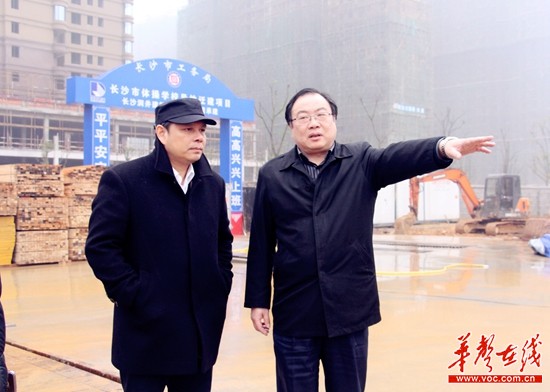 长沙市体育局党委书记江哲明(右)向罗超毅介绍长沙市体操学校异地迁建项目施工情况。