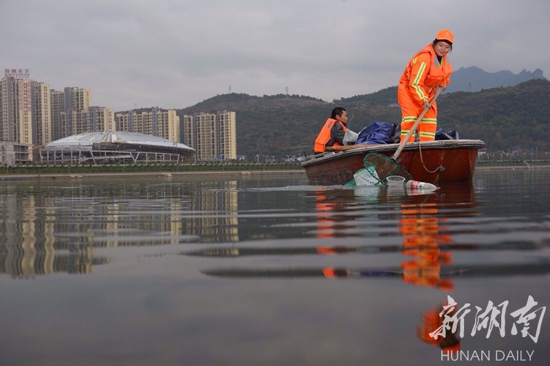 12月22日下午,澧水河张家界市永定区段,环卫工人在河面打捞垃圾。今年,该市环境卫生管理处水上环卫所加强城区178.80万平方米水域和32万平方米河堤护坡的保洁工作,营造优美洁净的休闲、观景环境。