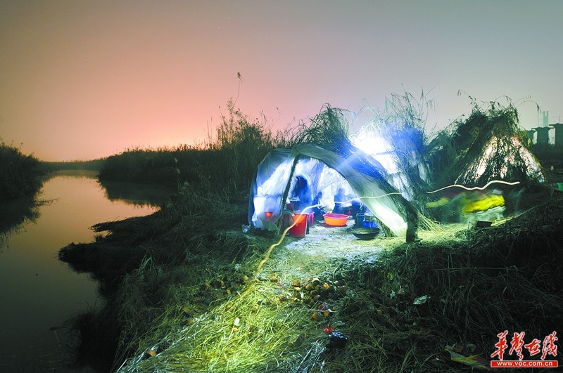 12月7日19时40分,砍苇工在做晚饭。为了节省费用,他们吃住都在临时搭建的简陋窝棚里。
