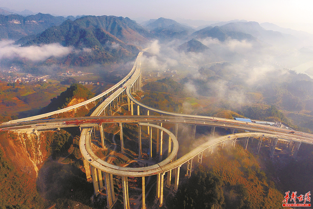 12月8日,吉首市曙光村,朝霞映照下的永吉高速公路吉首西互通。永吉(永顺至吉首)高速公路为我省西北部区域重要省际通道,是全省“七纵九横”高速公路网的重要组成部分。由于地质条件复杂,永吉高速公路蜿蜒在崇山峻岭之间,是省内桥隧比最高、施工难度最大的高速公路项目,预计明年11月建成通车。记者 郭立亮 通讯员 陈生真 摄