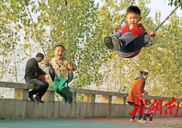 12月5日,长沙市湘江中路沿江风光带,小朋友在暖暖的阳光里欢快地荡秋千。近日,长沙日间气温持续升高,昼夜温差较大。市民应注意及时增减衣物,以免受凉感冒。