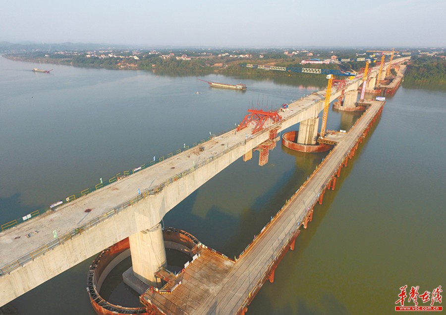 12月5日,怀邵衡(怀化至邵阳至衡阳)铁路控制性工程——跨湘江特大桥顺利合龙。该桥全长665.5米,以主跨M型连续梁跨越湘江,桥台采用T型台,主墩最高为24.85米。 彭斌 摄