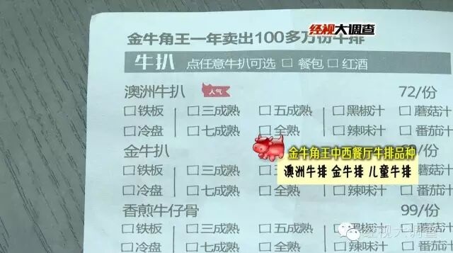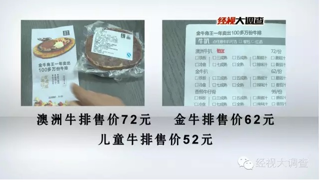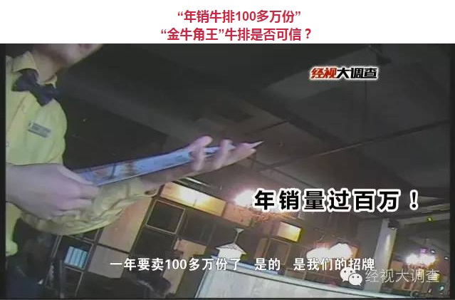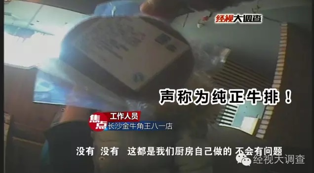 这两天,《经视大调查》连续独家曝光了长沙市场上一些牛肉、牛排造假的内幕,一些牛肉卷、牛排竟然是用猪肉、猪排加添加剂伪造,甚至流向了大型知名超市。那么,长沙一些高档中西餐厅里的牛排,又是不是像商家标榜的那样正宗呢?“金牛角王”中西餐厅是长沙乃至全省著名的餐饮企业,在全省拥有十多家餐饮店,“一年卖出100多万份牛排”更是这家知名餐饮企业响当当的招牌!这么金牛角王卖的牛排是不是真牛排呢?