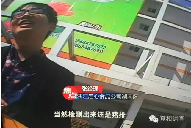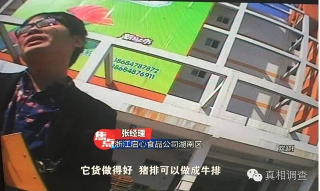 也印证了昨天节目里,供货商”浙江启心“公司湖南区张经理在面对记者拿出检测报告时说:猪排也可以做牛排!并称已经有了这种”技术“,消费者吃不出来!!