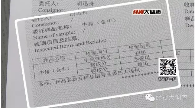 在等待了6天之后,记者拿到了检测报告!这份检测报告中指出,这份牛排里检测出了牛源性成分,没有检出猪成分,但是却检出了鸭成分。