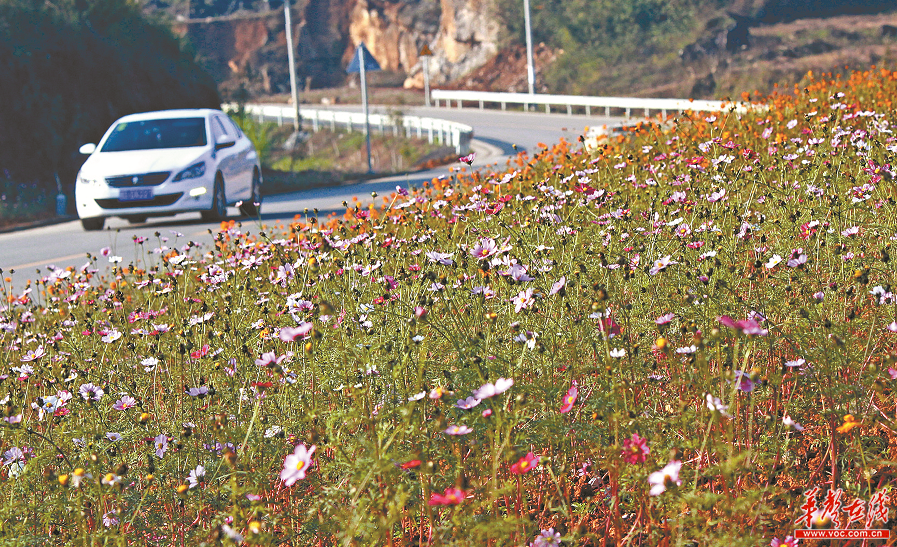 11月27日,花垣县团雅公路旁,花开正艳。今年,该县精心设计、精心施工、精细管理,打造和谐自然景观公路。公路两边分不同路段分别栽种了香樟、杜英、杜鹃、菊花、万年青等苗木花卉,一条公路不同景观,季季花开,四季常青。行车苗乡公路上,如在画中游。