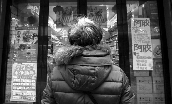 1月19日,长沙五一西路三泰街,一名老人来到曾经的典当行门口,如今这里已变成药店。图/记者陈韵骄