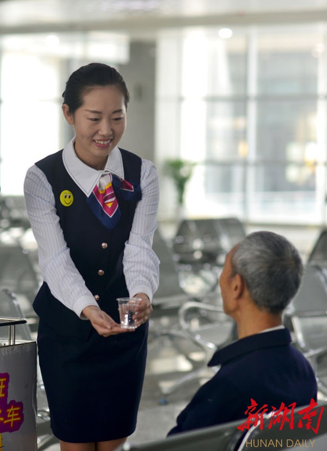 (长沙市汽车西站青春礼仪班服务人员为旅客提供热水。通讯员甘抱朴 陈东风摄)