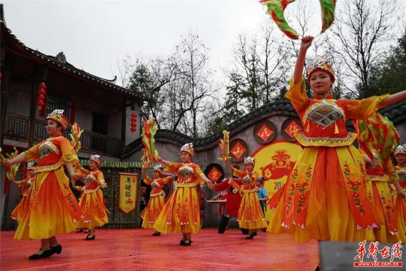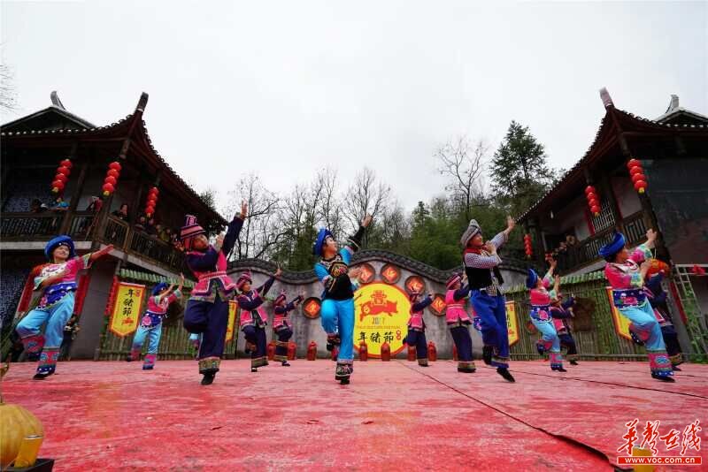 沅古坪镇栗山村 “年猪文化”“赶歌会”上演的《土家上梁》歌舞。
