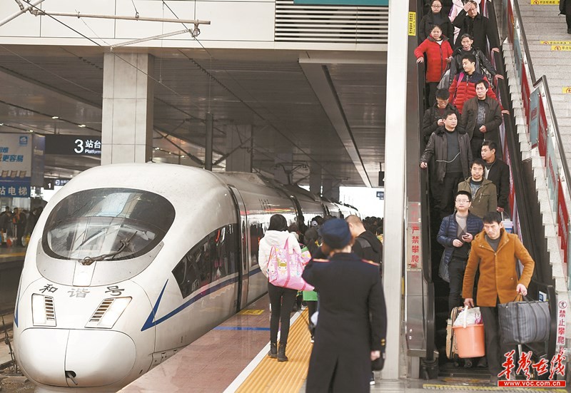 1月5日,长沙火车南站,旅客进站上车。当天起,全国铁路实行新的列车运行图。调图后,长沙火车南站增开高铁列车14对,长沙南动车组开行数量将高达454列,从长沙火车南站开行的动车组将达15个省会、4个直辖市。
