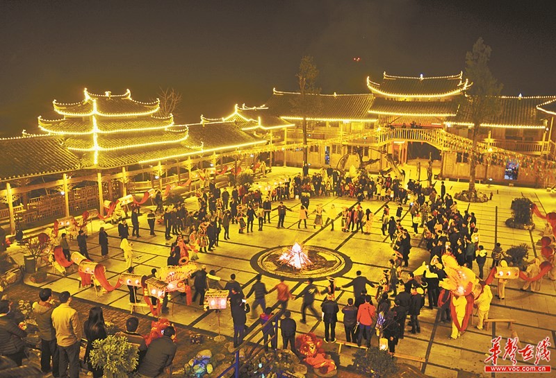 1月4日晚,溆浦县穿岩山国家森林公园枫香瑶寨,村民们举行热闹纷呈的舞狮、舞龙及篝火晚会迎接远道而来的游客。1月5日是传统腊八节,该景区准备了杀年猪、品腊八粥、打糍粑、抛绣球、演木脑壳戏、舞龙灯等一系列民俗活动,喜迎八方游客。 湖南日报记者 李健 余蓉 摄影报道