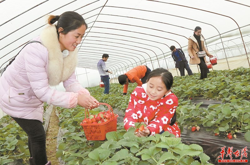 1月2日,宁远县城郊果优美草莓家庭农场,游客在采摘草莓。近年来,该县发展集特色农产品生产与农业休闲观光一体的家庭农场200多个,吸引了众多游客。