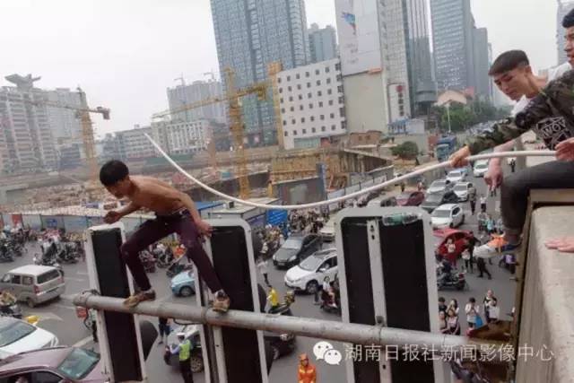 5月24日上午10点多,一上身赤裸的男子爬上长沙五一大道与黄兴路交汇的高架桥交通信号灯上,经过4小时拉锯后,男子纵身一跳,坠落地面。唐俊/摄