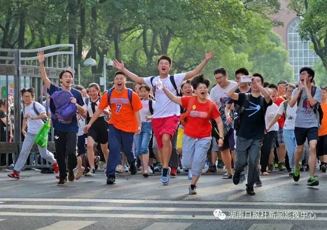 6月8日下午5时许,长沙市一中考点,考生们在欢声笑语中冲出考场。李健/摄