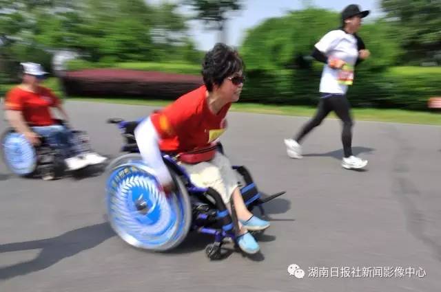 5月13日,首届全国轮椅马拉松体验赛在长沙橘子洲举行,参赛者在赛道上疾驰。田超/摄