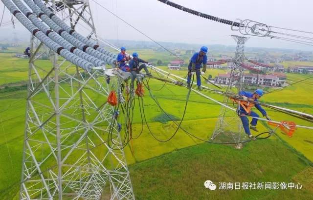 8月31日,酒泉-湖南±800kv特高压直流输电工程桃江县建设工地,湖南省电网工程公司施工人员进行耐张平衡挂线。 田超/摄