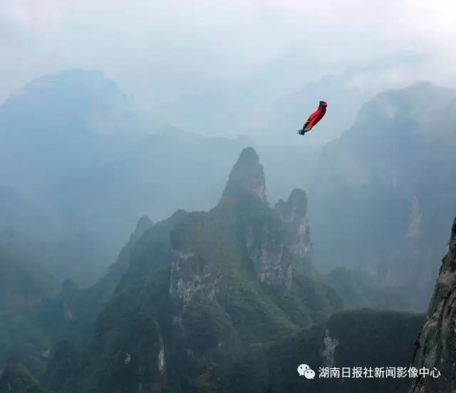 10月17日,张家界天门山风景区,翼装运动员从高空悬崖跳下,大山张“嘴”以待。郭立亮/摄