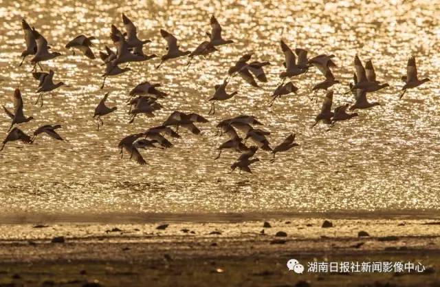 3月1日,岳阳东洞庭湖,一群反嘴鹬从波光粼粼的湖面掠过。张京明/摄