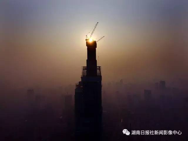 4月28日早晨,建设中的湖南第一高楼——九龙仓长沙国际金融中心封顶。郭立亮/摄