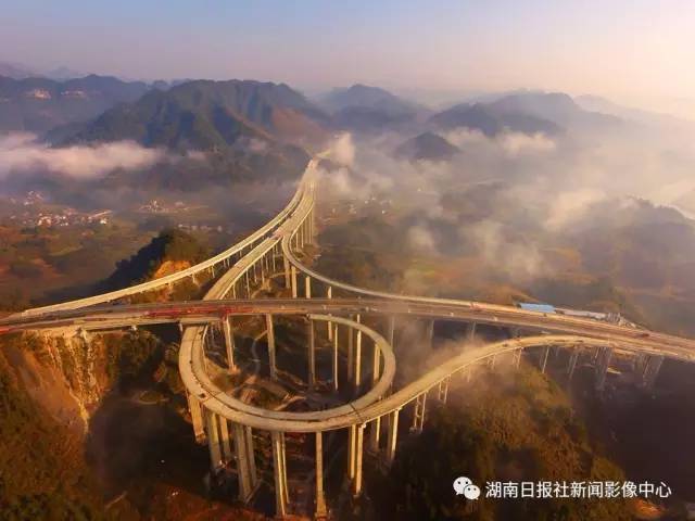 12月8日,吉首市曙光村,朝霞映照下,建设中的永吉高速公路吉首西互通如游龙蜿蜒。郭立亮/摄