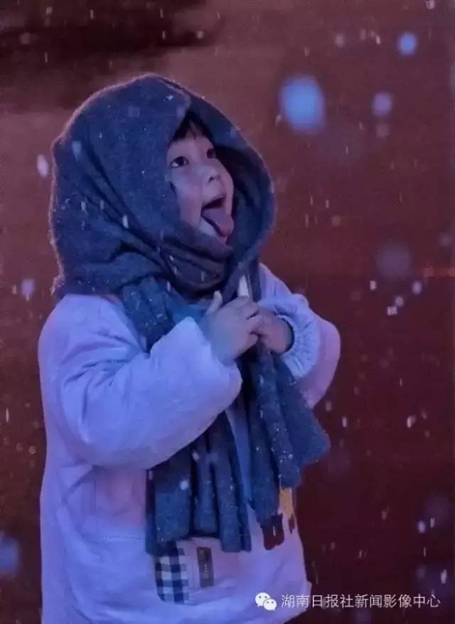 1月31日晚,长沙市火车站广场,小女孩兴奋地伸出舌头品尝雪的味道。唐俊/摄