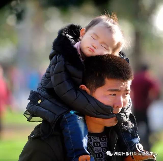 2月27日,长沙橘子洲头景区,踏春的小宝贝坐在爸爸的肩上睡着了。郭立亮/摄