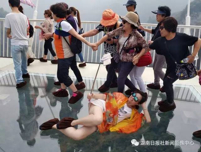 9月25日,张家界大峡谷玻璃桥上,几名韩国游客惊叫着走过距谷底相对高度约300米玻璃桥,而旁边一个美女却自若地躺下自拍。郭立亮/摄