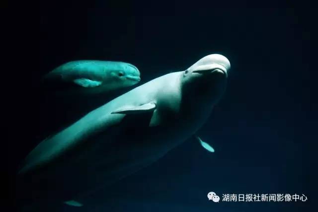 11月20日上午,长沙海底世界,白鲸宝宝亲昵地紧贴着妈妈“卓雅”游玩。田超/摄