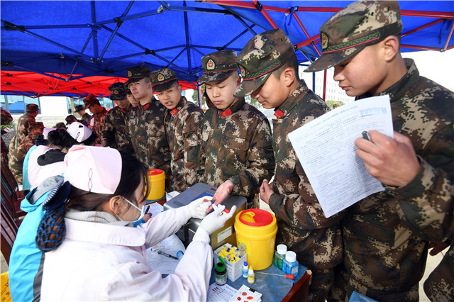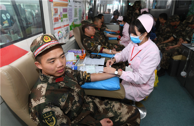 2月22日下午,武警湖南总队直属支队的官兵在献血。春节过后,长沙血液库存偏低。得知情况后,该支队主动与长沙血液中心联系,组织官兵无偿献血。当天,共有107名官兵参与,累计献血36200毫升。 湖南日报记者 田超 通讯员 龙丹 摄影报道
